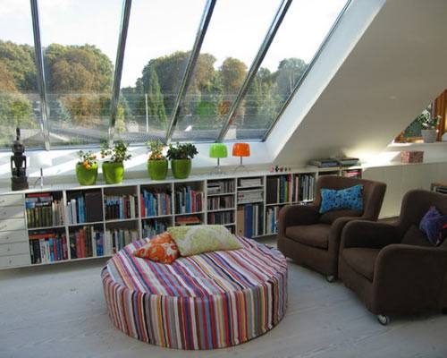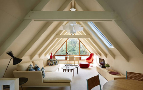 别墅阁楼屋顶的斜窗保证了室内的采光,白天抬头就能看见清新明朗的蓝天白云,晚上可以和家人在阁楼上仰望夜空中的繁星,这是一件多么浪漫的事情。